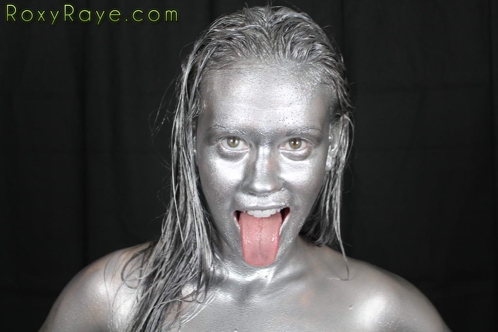 Amateur model Roxy Raye sports a metallic look while dildoing her asshole