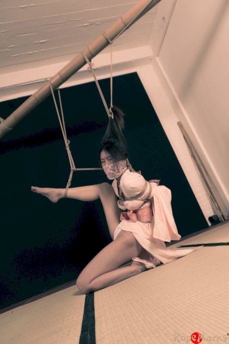 Asian chick Flawless Meow is tied with rope by her limbs and hair