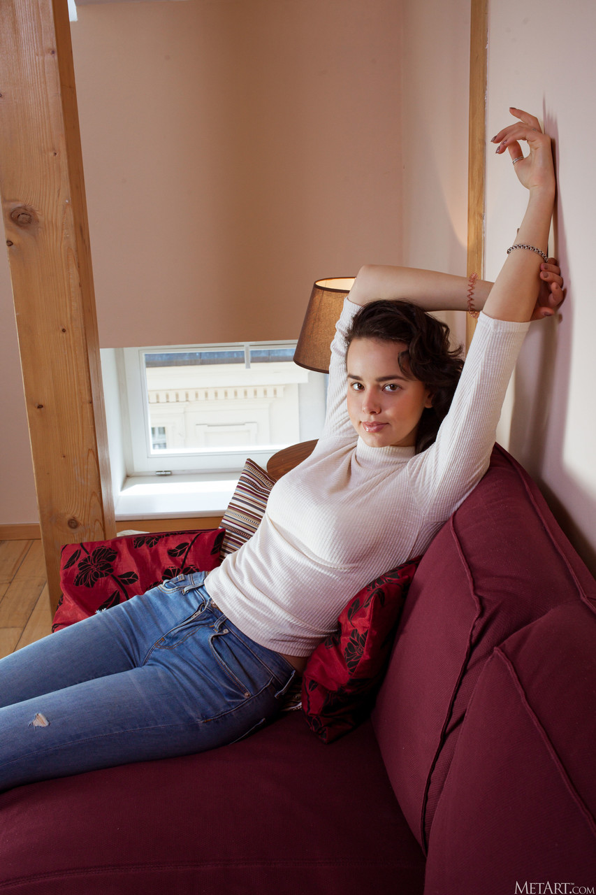 Beautiful babe Arcadia strips & shows her big ass, perky tits and bald holes