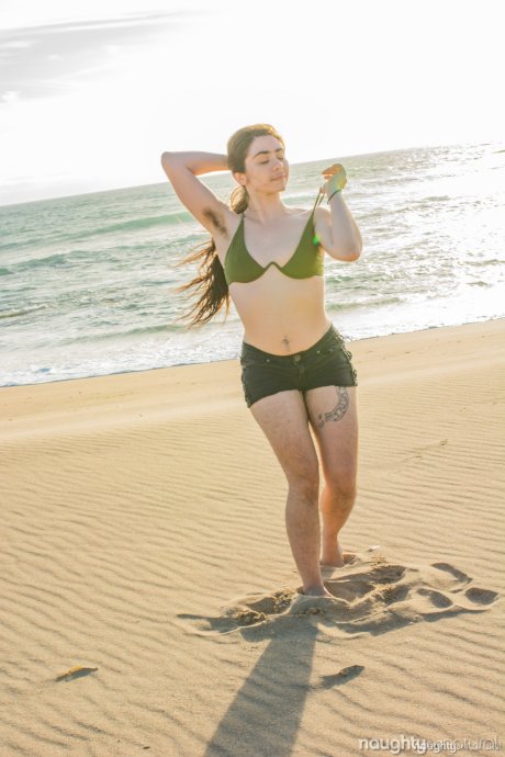 Beauty Kisa Fae strips her green bikini on the beach & shows her hairy body