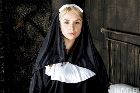Cosplay solo girl Sara Sloane strips off nun's uniform for pornstar shoot