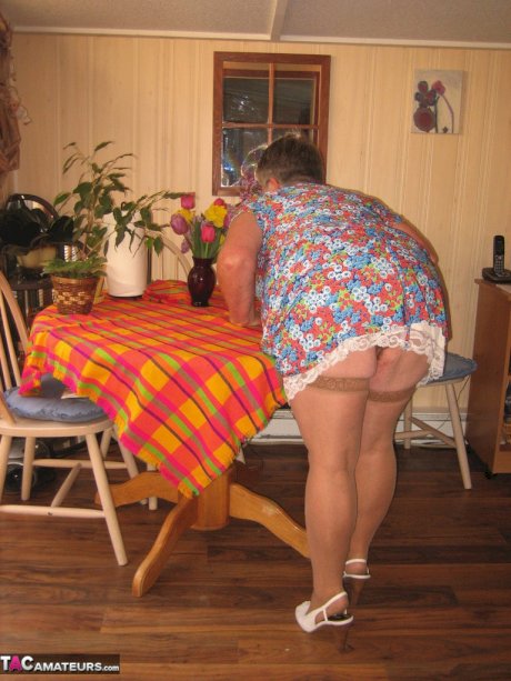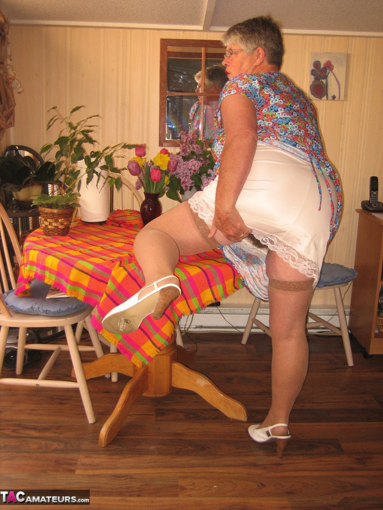 Fat granny Girdle Goddess exposes her huge boobs in a girdle and nylons