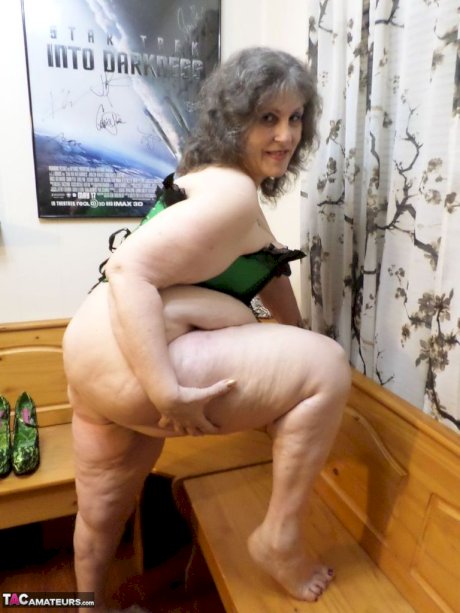 Fat old woman Bunny Gram spreads her snatch after removing heels and hosiery