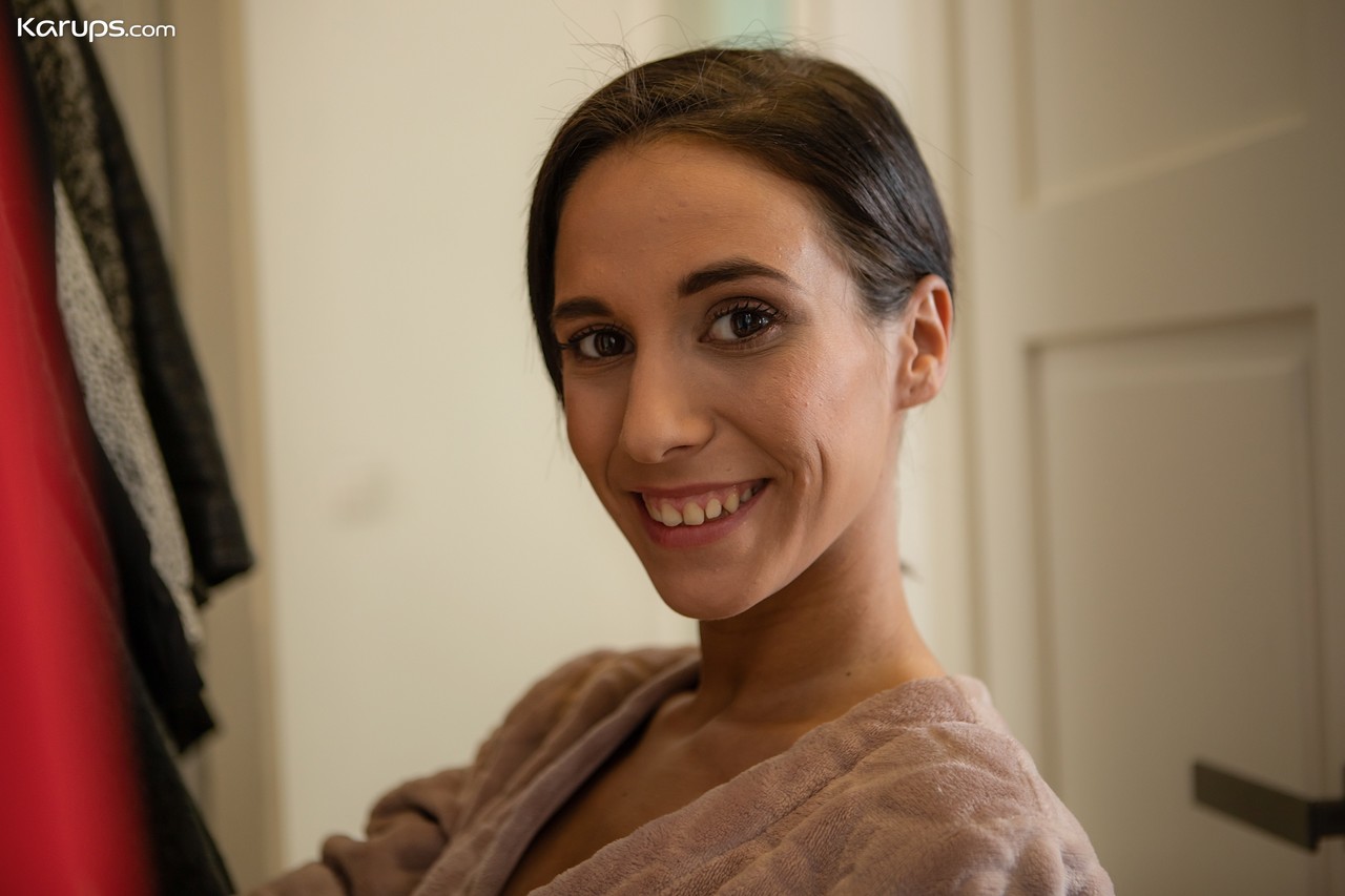 First timer Kitty Fox seduces a ripped man in a short robe and black lingerie