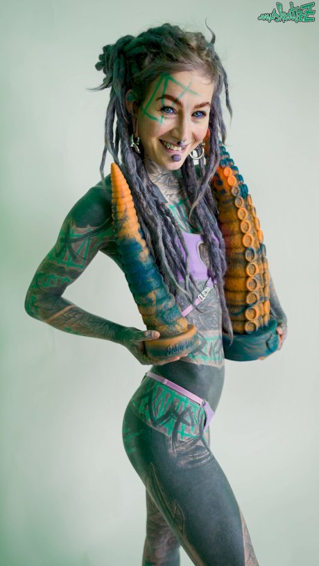 Heavily tattooed girl Anuskatzz holds a couple of taintacle toys in the nude