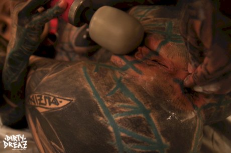 Heavily tattooed girl fists her pussy after masturbating with a sex toy