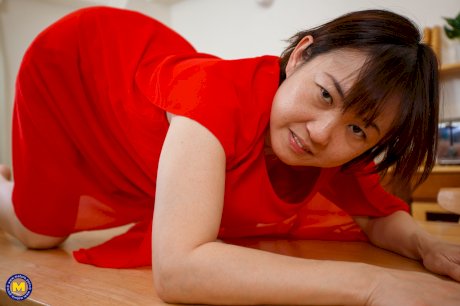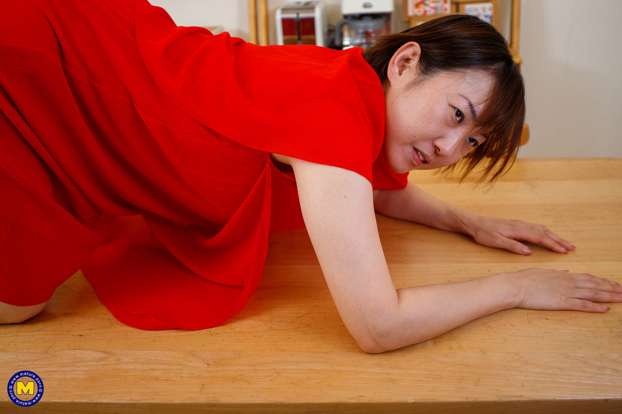 Japanese mom Yuki Kozakura posing in her red dress and panties in a solo