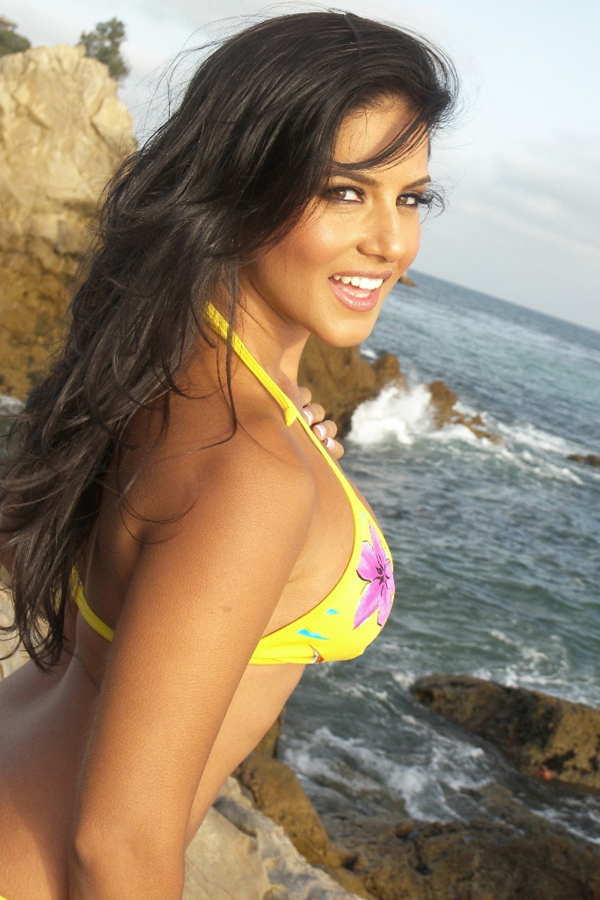 Pretty Indian MILF Sunny Leone teasing in a sexy yellow bikini at the beach