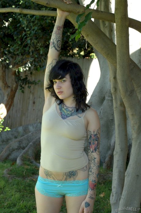 Tattooed punk chick takes her clothes off and poses in the backyard